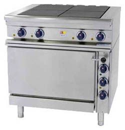 Профессиональная электрическая четырехконфорочная плита Kovinastroj (Kogast) ES-T47/1, артикул 55827 с напольной установкой и жарочным шкафом, для кафе, школьных и других столовых, ресторанов, заведений фаст-фуд, кулинарий и других предприятий общественного питания, торговли и пищевых производств. Входит в состав модульной тепловой линии глубиной 700 мм.