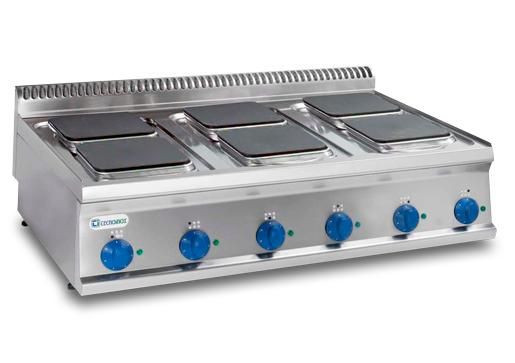 Настольная электрическая плита с 6 квадратными конфорками (220х220мм), со встроенным термостатом, который автоматически уменьшает выпускаемую мощность при отсутствии котла. Конфорки герметично укреплены на штампованной поверхности с углублением против перелива жидкостей, что обеспечивает легкую и качественную чистку. Регулятор мощности на 7 позиций. Для безопасности и экономии электроэнергии предусмотрены лампочки - индикаторы включенных конфорок.