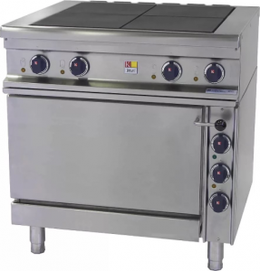 Профессиональная электрическая четырехконфорочная плита Kovinastroj (Kogast) ES-T47/1K артикул 55830 с напольной установкой и жарочным шкафом с конвекцией, для кафе, школьных и других столовых, ресторанов, заведений фаст-фуд, кулинарий и других предприятий общественного питания, торговли и пищевых производств. Входит в состав модульной тепловой линии глубиной 700 мм.