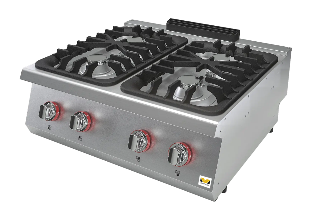 Плита газовая Vortmax SGK 78 — это профессиональное настольное оборудование с четырьмя мощными открытыми конфорками, предназначенное для интенсивного использования на предприятиях общественного питания.