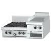 Плита газовая оснащена на две трети 4-мя конфорками, на одну треть - плоской поверхностью 288х962 мм, есть жиросборник из нержавеющей стали. Настольное исполнение. Каждая конфорка имеет съемную чугунную решетку. Лицевая часть плиты и боковые стороны выполнены из нержавеющей стали. Вдоль конфорок располагается нейтральная поверхность для посуды, глубиной 191 мм, из нержавеющей стали. Плита работает на сжиженном газе пропан-бутан. Расход газа: 118000BTU/ч. Плита комплектуется задним бортиком высотой 10\'\' (254 мм), фланцами 38мм.