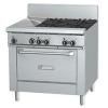 Сплошная плоская поверхность шириной 305мм (на две конфорки) с 1 зоной нагрева + 4 конфорками справа, жарочный шкаф. Размеры всей рабочей поверхности – 900х686мм. Толщина сплошной поверхности – 16 мм. Мощность одной конфорки – 26000Btu/h или 7610Вт. Мощность сплошной поверхности - 18000Btu/h или 5270Вт. Каждая конфорка имеет съемную чугунную решетку размером 305х345мм, защиту от прекращения подачи газа. Поджигаются вручную. Сплошная поверхность имеет пьезоподжиг. Каждая рабочая секция шириной 305 мм оснащена штампованным съёмным жиросборником, днище которого имеет углубления. Вдоль конфорок располагается нейтральная поверхность для посуды, шириной 127мм, из нержавеющей стали.