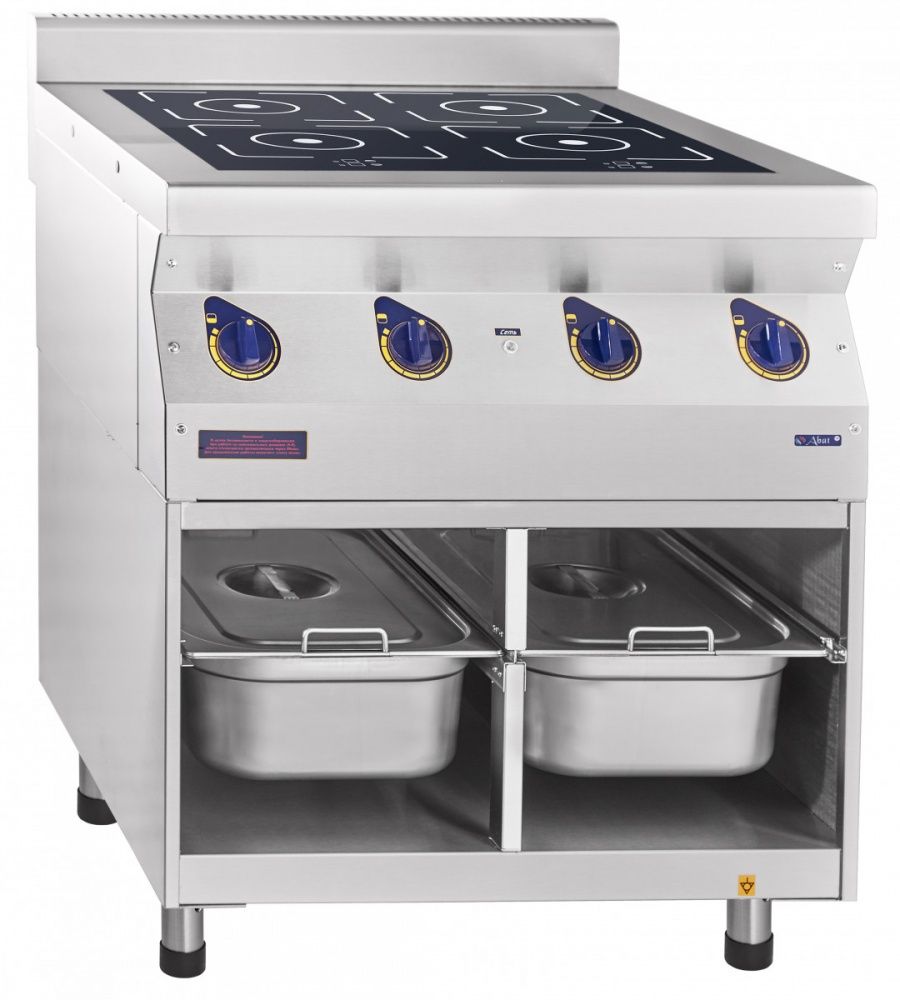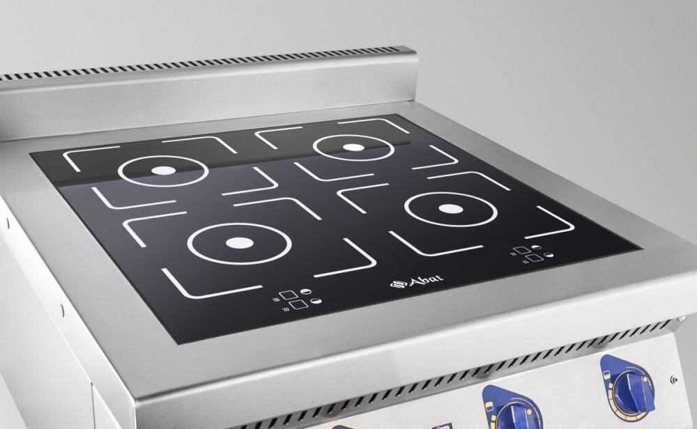 Плита четырехконфорочная профессиональная индукционная Abat КИП-47Н (71000019410) со сдвоенным индуктором для приготовления первых, вторых и третьих блюд в наплитной посуде в кафе, ресторанах, столовых и других предприятиях общественного питания и торговли. Может использоваться отдельно или в составе тепловой линии.