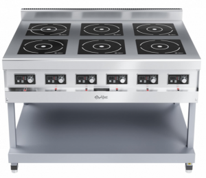 Плита индукционная промышленная КИП-69П-5,0 является элементом модульной тепловой линии Абат 900. Шесть конфорок, сплошная рабочая поверхность позволяет легко передвигать тяжелую посуду. Используемая посуда должна обладать магнитными свойствами (к ней должен притягиваться магнит) и иметь плоское дно. Может использоваться посуда из нержавеющей стали или алюминия с ферромагнитным дном, чугунная посуда. Крашенная подставка.