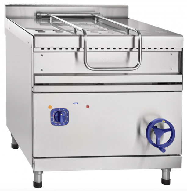 Промышленная опрокидывающаяся сковорода ЭСК-90-0,47-70 - элемент модульной электрической тепловой линии Абат 900. Оснащена стальной цельнотянутой прямоугольной чашей объемом 70 литров, откидной крышкой и ручным приводом опрокидывания. Крышка фиксируется в любом положении. Механизм опрокидывания используется для выгрузки готовой продукции, а также для облегчения очистки и ухода. Терморегулятор автоматически поддерживает заданную температуру.