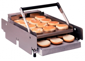 Тостер контактный горизонтальный Prince Castle 297-T9FCE. Одна створка, таймер, регулировка температуры нагрева. Регулировка зазора. Позволяет одновременно карамелизовать до 12 булочек. Оптическая и звуковая сигнализация о завершении цикла работы.