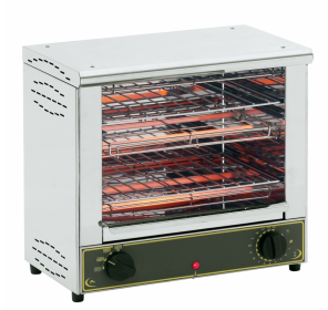 Тостер Roller Grill BAR 2000 предназначен для разогрева и поджаривания готовых к употреблению кулинарных изделий: булочек, бутербродов, рулетов, закрытых сэндвичей, сосисок, пицц и т.д. на предприятиях общественного питания и торговли. Модель оснащена 2 поворотными тумблерами для регулировки температуры нагрева рабочей поверхности и таймером на 15 минут с возможностью отключения. Корпус выполнен из нержавеющей стали AISI 304.