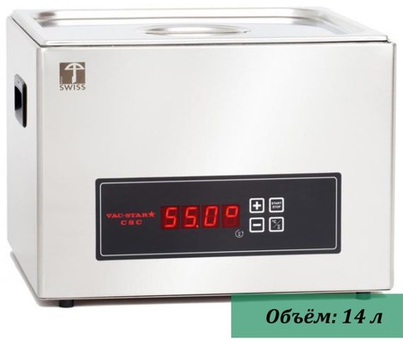 Vac-Star CSC-Medium - водяная баны для технологии Су-Вид (sous-vide). Объем 14 литров. Размер ёмкости: 323х297х150 мм. Температурный режим: от 25-99С. Таймер. Звуковой и оптический предупредительный сигнал. Для профессионального использования в кафе, ресторанах, столовых и других общепитах. Напряжение: 220В, 1 кВт.