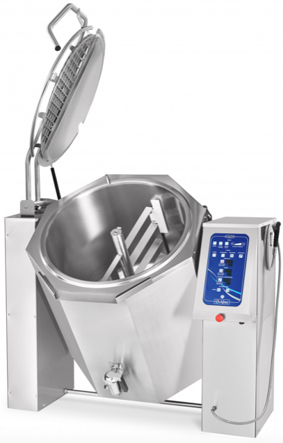 - защитная решетка крышки котла позволяет осуществлять визуальный контроль процесса приготовления, а также предоставляет возможность добавления ингредиентов в котел без остановки процесса перемешивания; накрывается сплошной малой крышкой, которая легко снимается для мойки;